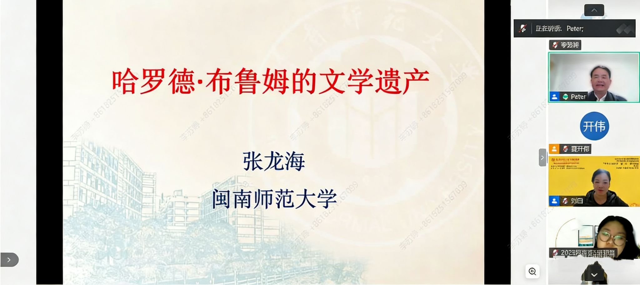 由教育部文学文化课程虚拟教研室、教育部师范教育协同提质计划主办,我校比较文学与文化研究所承办的“中外人文经典‘悦’读”系列活动第10讲顺利举行。本次活动特邀闽南师范大学校长张龙海教授担任主讲人,深度聚焦“哈罗德·布鲁姆文学遗产”开讲。讲座由我院副院长刘白教授主持,近三百名校内外师生相聚云端,共享此次学术盛宴。讲座伊始,刘白教授致欢迎辞,并隆重介绍了主讲嘉宾。她指...