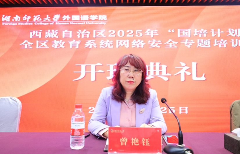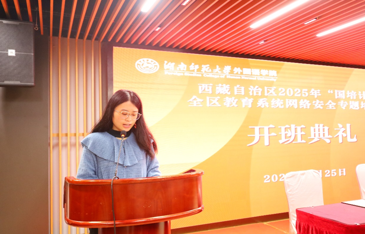 曾艳钰致欢迎词。她就学院的办学历史、学科设置、师资力量与教改成果进行了详细介绍。她强调,此次培训是赋能西藏教育网络安全队伍建设的关键一环,既是业务能力的“充电站”,更是守护教育网络安全责任的“再动员”。她勉励全体学员深化学习,将所学所获转化为守护西藏教育信息化的坚实盾牌,共同筑牢祖国边疆的教育网络安全防线,真正做到“学有所获、学以致用”。
