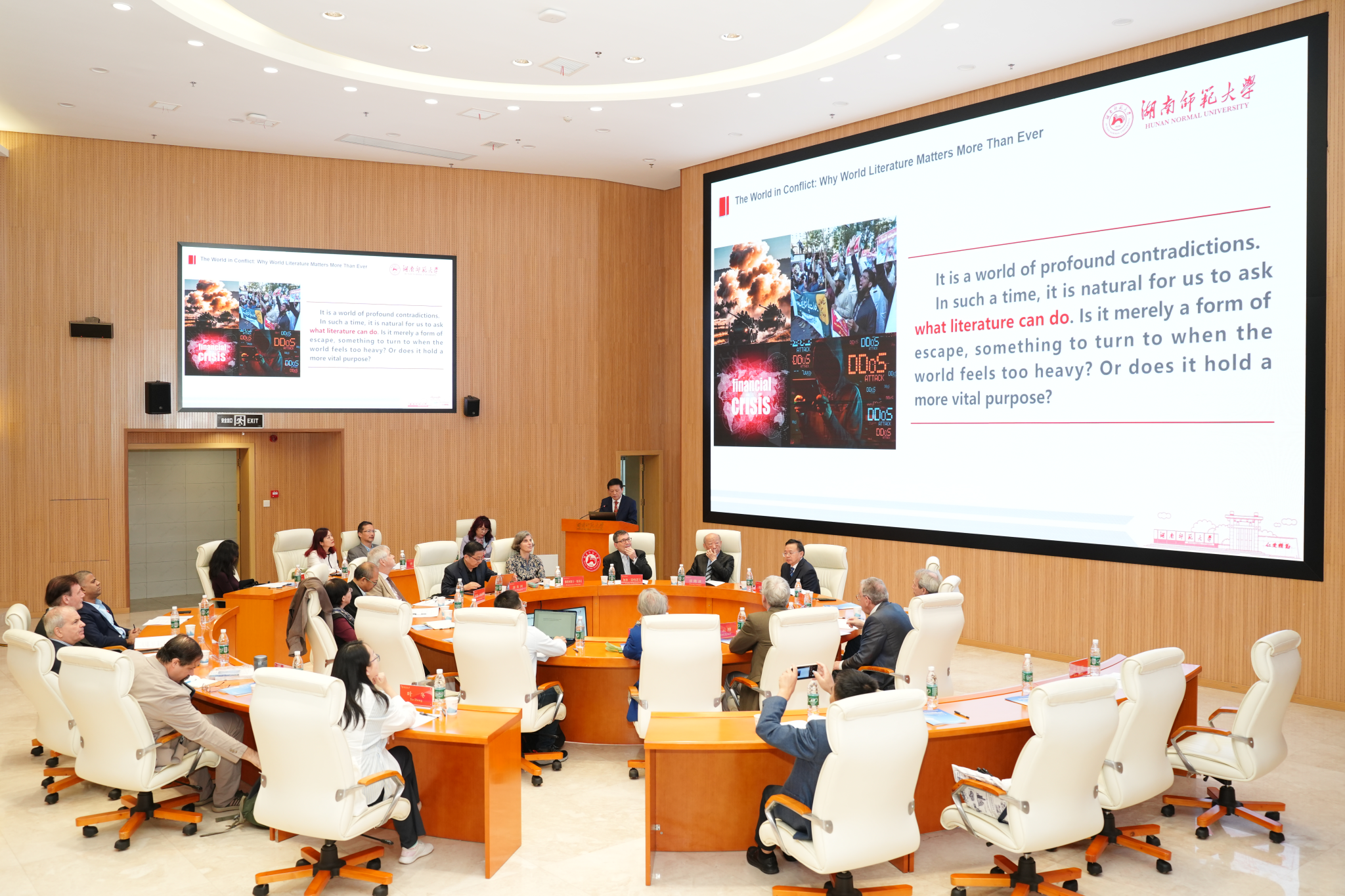 在持续两天的主旨报告环节,14位国内外顶级专家学者先后发言。鲁汶大学西奥・德汉教授认为当今世界文学研究正从英语中心转向关注地缘政治与地缘文化的全球议题。我校“潇湘学者特聘教授”奥特玛·埃特教授指出,自二十世纪中叶以来,新的“世界文学”观念开始形成,文学体系呈现出了多元逻辑的特征。哈佛大学大卫·达姆罗什教授提出“文字世界”的概念,强调了书写系统不仅是语言工具,更是跨越时代与文明的文化记忆载体。曾艳钰教授揭示了二十世纪早期英美现代主义期刊在构建跨国文学网络、生成“世界文学”过程的关键作用。渥太华大学伊恩·丹尼斯教授借用模仿理论与生成人类学探讨了东西方文学中“真实欲望”与“社会欲望”的对称张力。中国人民大学郭英剑教授探讨了世界文学如何在地缘冲突与文化分裂中充当沟通之桥,促进全球共情与理解。浙江大学郝田虎教授阐释了莎士比亚与弥尔顿如何对中国现代文学与文化的发展产生了深远影响。伦敦大学亚非学院弗朗西斯卡·奥西尼教授审视了印度文学传统与世界文学话语的复杂关系,批判了世界文学中的欧洲中心主义倾向。我校任海燕教授借用中国哲学中的“天下”理念为重新界定世界文学的“世界性”提供了新的阐释维度。伦敦玛丽皇后大学加林·提哈诺夫教授通过分析欧洲、俄罗斯与中国的后浪漫主义,揭示了世界文学中文化与话语的跨时空迁移过程。中国社会科学院刘雪岚副研究员指出世界女性文学通过断裂与整合的互动,推动了跨文化对话与全球文学网络的发展。阿尔伯塔大学傅云博教授强调世界文学不仅是跨文化阅读的对象,更应成为“可写文本”,通过创作与翻译实践不断重构其意义与价值。我校余承法教授从世界文学视角考察韩国诺贝尔文学奖得主韩江的文学作品在中国的翻译与接受情况。张隆溪教授深入梳理了西方诗学传统的脉络与特征,阐释了中国诗学的情感意蕴,强调通过融合两者视角来拓展世界诗学的“异质宇宙”,为文学理论注入新的生命力。期间,我校欧乐·德林教授、吴漠汀教授、大卫·安德鲁·波特副教授、阿米尔·汗副教授开设了题为“意义的流通:比较视角下的中国、欧洲与美洲”的圆桌论坛,引发了热烈讨论。