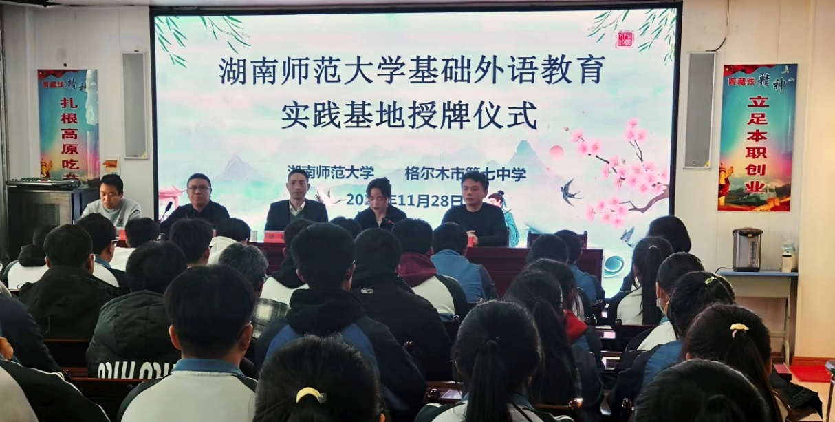 梁斌回顾了我院的办学历史与成就,重点介绍了学院在服务基础教育方面的系统布局。他介绍到,学院依托“湖南省外语基础教育研究中心”和“曾艳钰乡村外语教育创新工作室”两大平台,已构建起覆盖全国的外语基础教育实践基地网络。梁斌表示,学院将携手格尔木七中,共同开展教学研究、共享优质资源、共育时代新人,努力将基地打造为推动青藏高原地区基础外语教育发展的示范点,为培养具有中国情怀与世界眼光的新时代青年贡献校地力量。