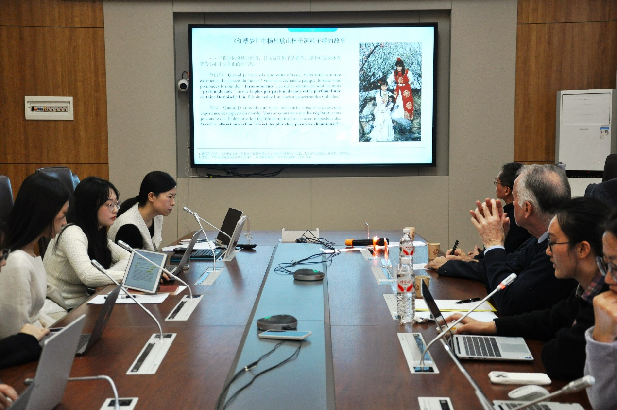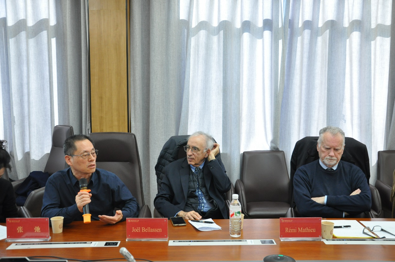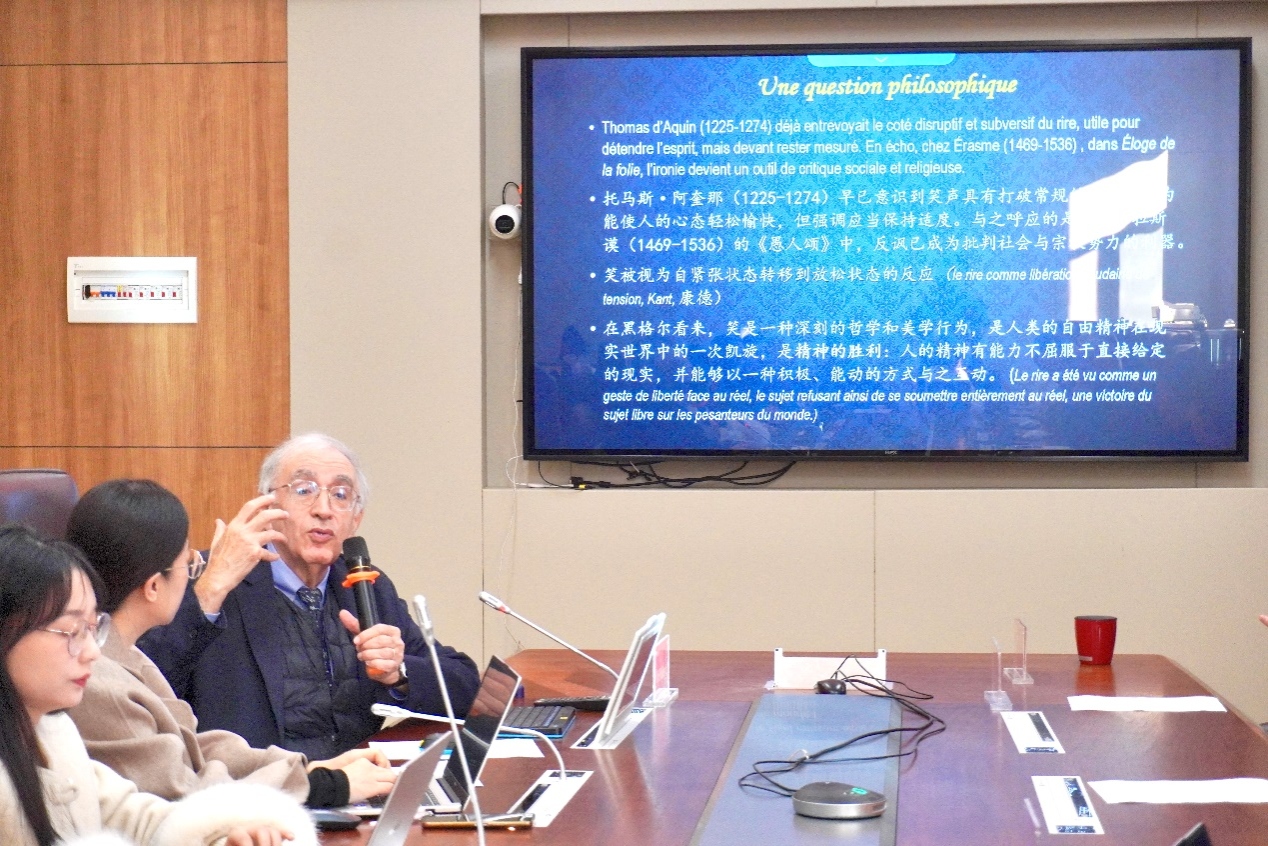 本届工作坊由我校外国语学院张弛教授主讲,特邀法国国立东方语言文化学院(INALCO)白乐桑(Joël Bellassen)教授以及法国国家科学研究院(CNRS)雷米·马修(Rémi Mathieu)教授联袂担任主讲嘉宾。本届工作坊以“幽默与翻译:幽默作为共享能力”(Humour et traduction : l’humour comme compétencepartagée)为主题,展开了一场为期半天的深度学术对话。法语系教师和硕博研究生参会。