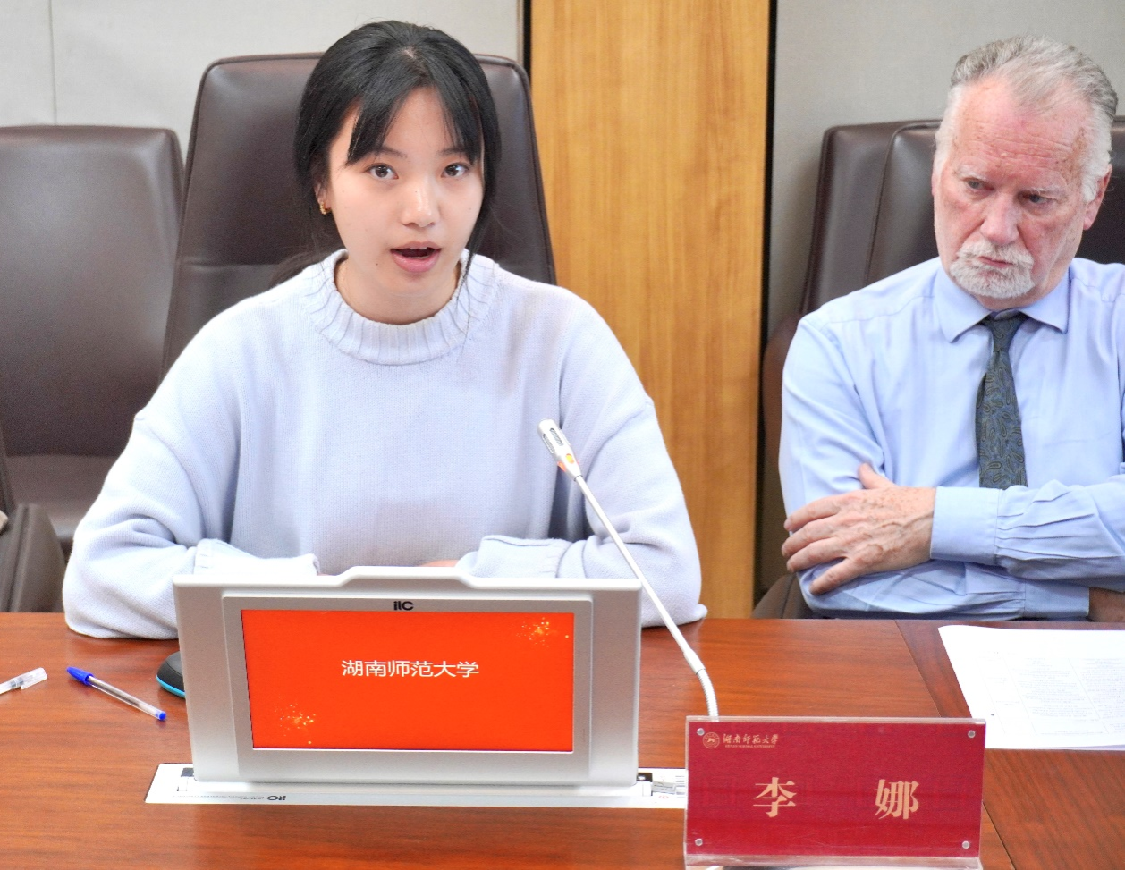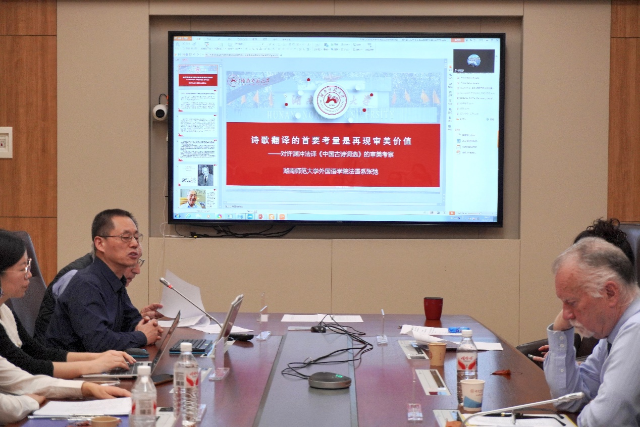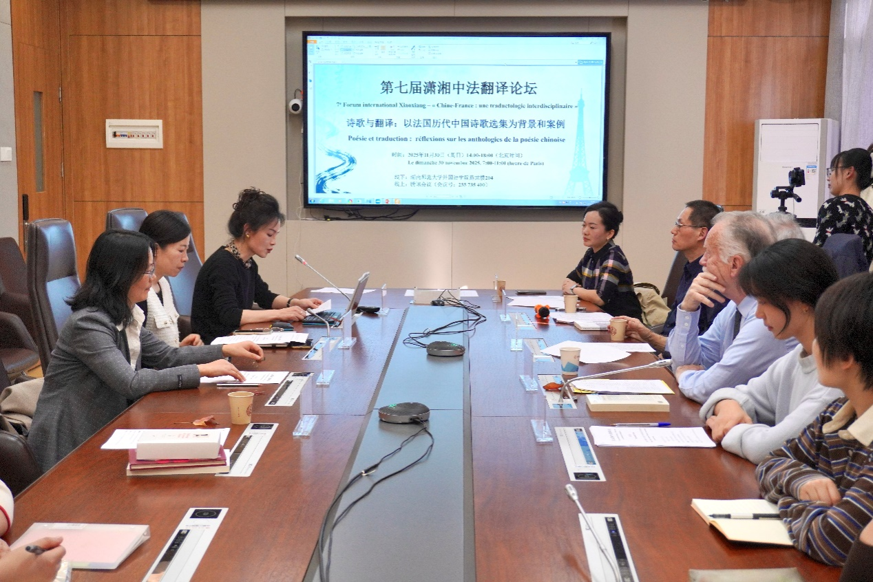 (通讯员 曾凌楷 陈丹 王淮星 仲佳洁)2025年11月30日下午,我院法语系主办的第七届“潇湘中法翻译论坛”顺利举行。本次论坛主题为“诗歌与翻译:以法国历代中国诗歌选集为背景和案例”(Poésie et traduction : réflexions sur les anthologies de la poésie chinoise)。论坛在湖南师范大学外国语学院腾龙楼204会议室与腾讯会议线上平台同步举行,湖南师范大学法语系师生、法国国立东方语言文化学院中文系、法国国家科学研究中心、中山大学、华东师范大学、首都师范大学、南京大学的专家学者以及国内外其他院校的师生,共60余人参加会议。