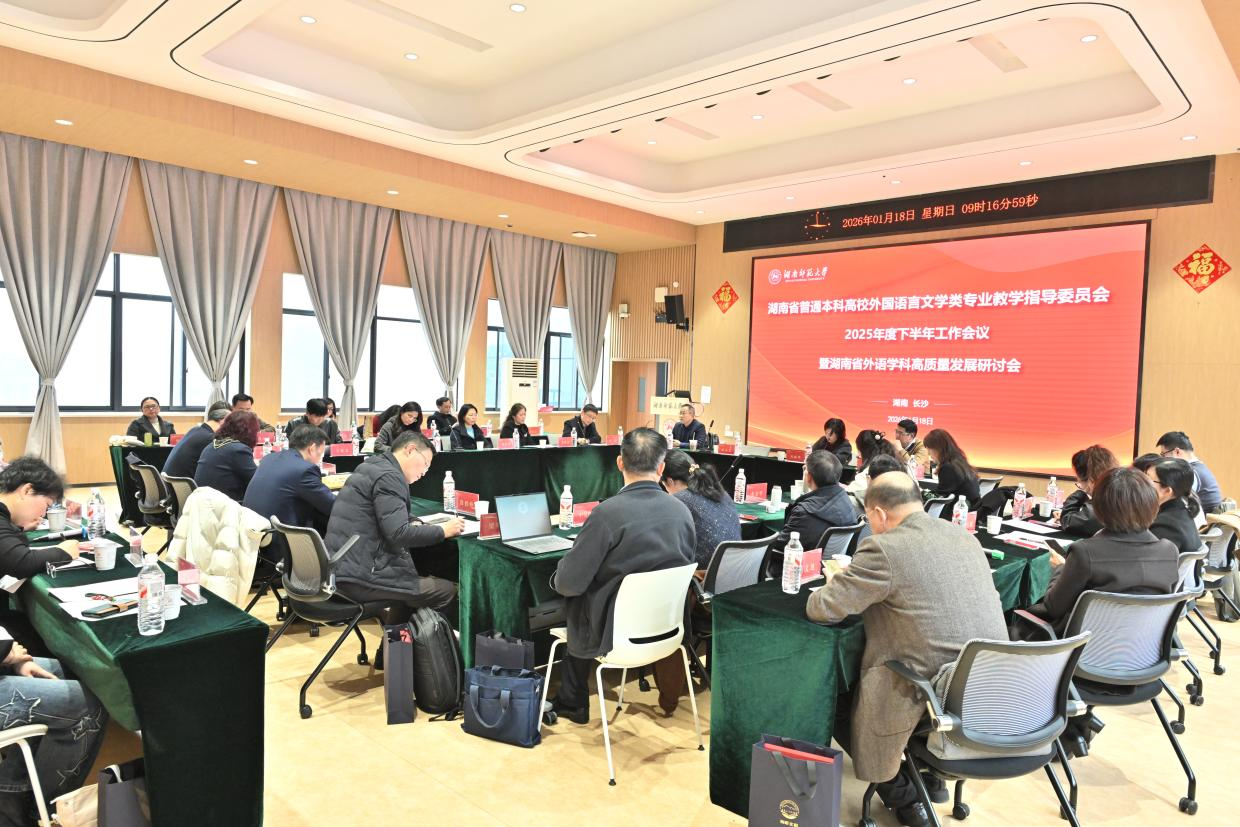 (通讯员 谢敏敏)2026年1月18日上午,湖南省普通本科高校外国语言文学类专业教学指导委员会2025年度下半年工作会议暨湖南省外语学科高质量发展研讨会在我院举行。会议由教指委秘书长、学院院长曾艳钰主持。会议围绕“落实‘两优方案’,优化外语学科布局”和“推进‘数智赋能’,提升外语教育质量”两大主题展开,教指委委员及省内各高校外语学院负责人参加会议。
