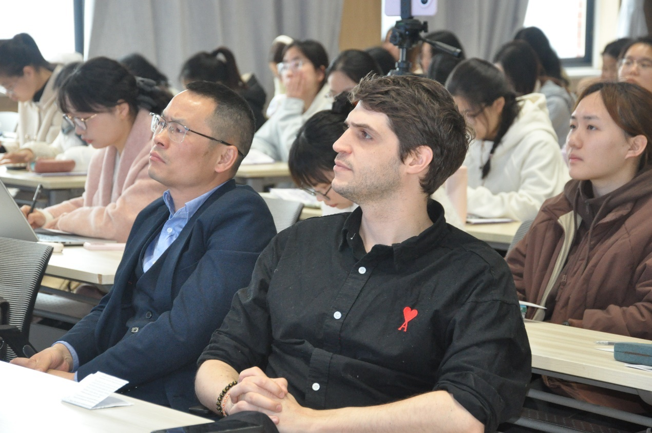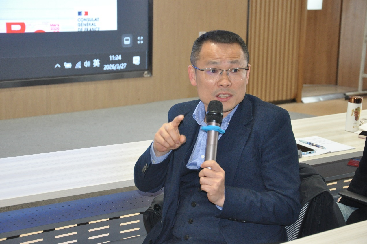 本次活动由法国驻武汉总领事馆主办,经我校国际交流处协调,由我院承办,是2026年“潇湘法语讲坛”与“法语活动月”的重要组成单元。与裴诺先生一同参加此次活动的还有法国驻武汉总领事馆文化项目官员王俊先生。活动由我院法语系主任方丽平老师主持。华中科技大学等高校的近百名法语系师生共同参与了此次交流。