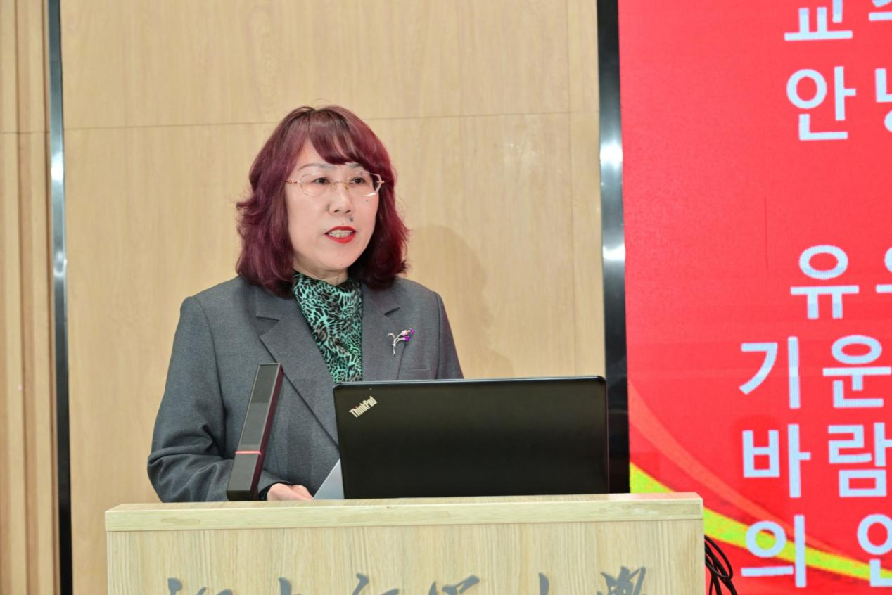 学院院长曾艳钰教授致欢迎词。她首先代表学院向来自国内外高校的专家学者表示热烈欢迎与诚挚感谢。她指出,本次会议不仅是中韩学术界的重要对话,更是在构建中国自主知识体系背景下推动东亚古典学研究纵深发展的重要学术实践。她强调,蔡美花教授团队历时多年编撰的《朝鲜古代文论校注》(全15册)今日发布,是学术界具有里程碑意义的重要成果。这部丛书既标志着学院“世界一流”学科建设取得重大进展,也为构建东亚古典学自主知识体系、深化汉字文化圈文明互鉴提供了坚实文献支撑。