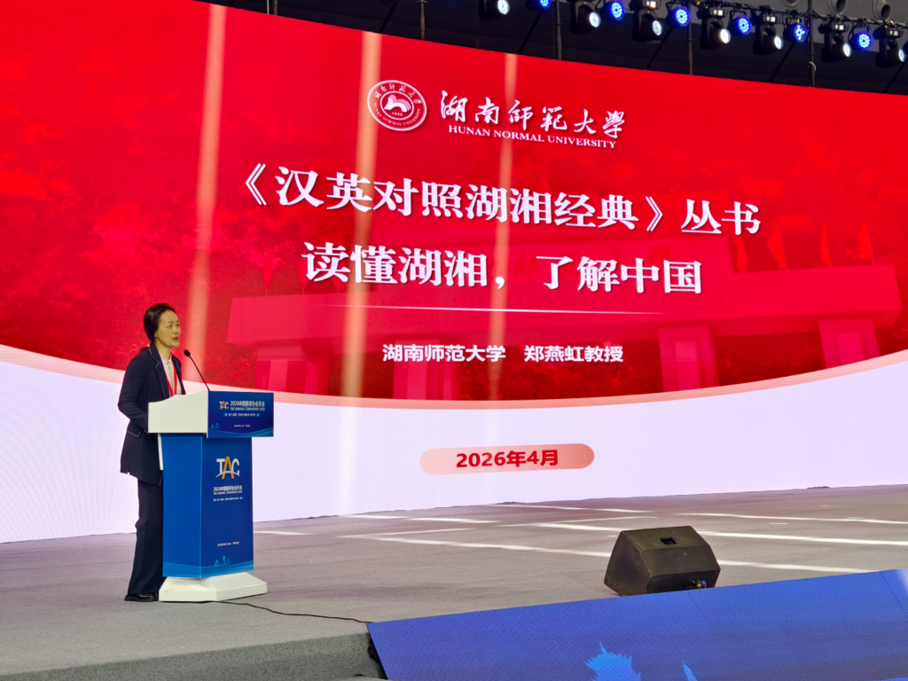 4月25日,2026中国翻译协会年会在武汉隆重举行。开幕式上,“汉英对照湖湘经典丛书”(第一辑) 获评年度重大翻译成果。该丛书由我院郑燕虹教授、蒋洪新教授、尹飞舟教授担任主编,院长曾艳钰教授及刘云雁、何正兵、彭天笑、乐国斌等教师与博士参与翻译,岳麓书社出版发行。在年会 “会员单位重大翻译成果” 专题环节,郑燕虹教授受邀作成果汇报,系统阐释丛书编纂理念、翻译范式与传播价值,得到全国翻译界高度关注与广泛好评。