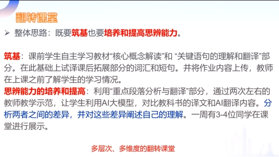 在主题分享环节,左晋老师以《朝鲜语笔译工作坊》课程为例,系统介绍了“翻转课堂+项目式教学”的创新教学模式。该课程针对研究生学情特点,设计了“筑基”与“思辨能力培养”双轨并行的教学体系。课前学生通过自主学习完成基础知识积累,课堂上则通过对比教材译文与AI翻译成果,培养学生的批判性思维和独立翻译能力。