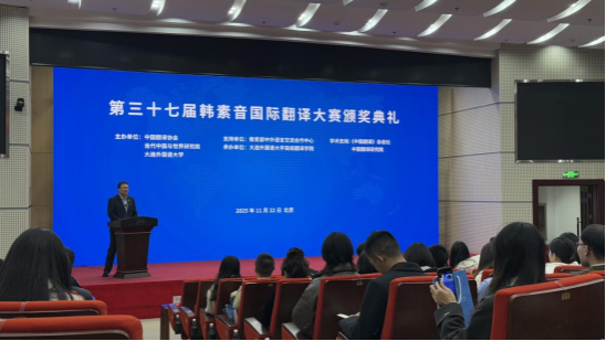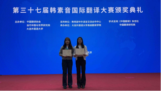 (通讯员:张美玲)2025年11月22日,第三十七届韩素音国际翻译大赛颁奖典礼在北京举行。我院朝鲜语笔译专业学子表现卓越,斩获佳绩。2024级朝鲜语笔译专业Kim Goeun(金高恩)获汉译朝一等奖,张美玲获朝译汉优秀奖。