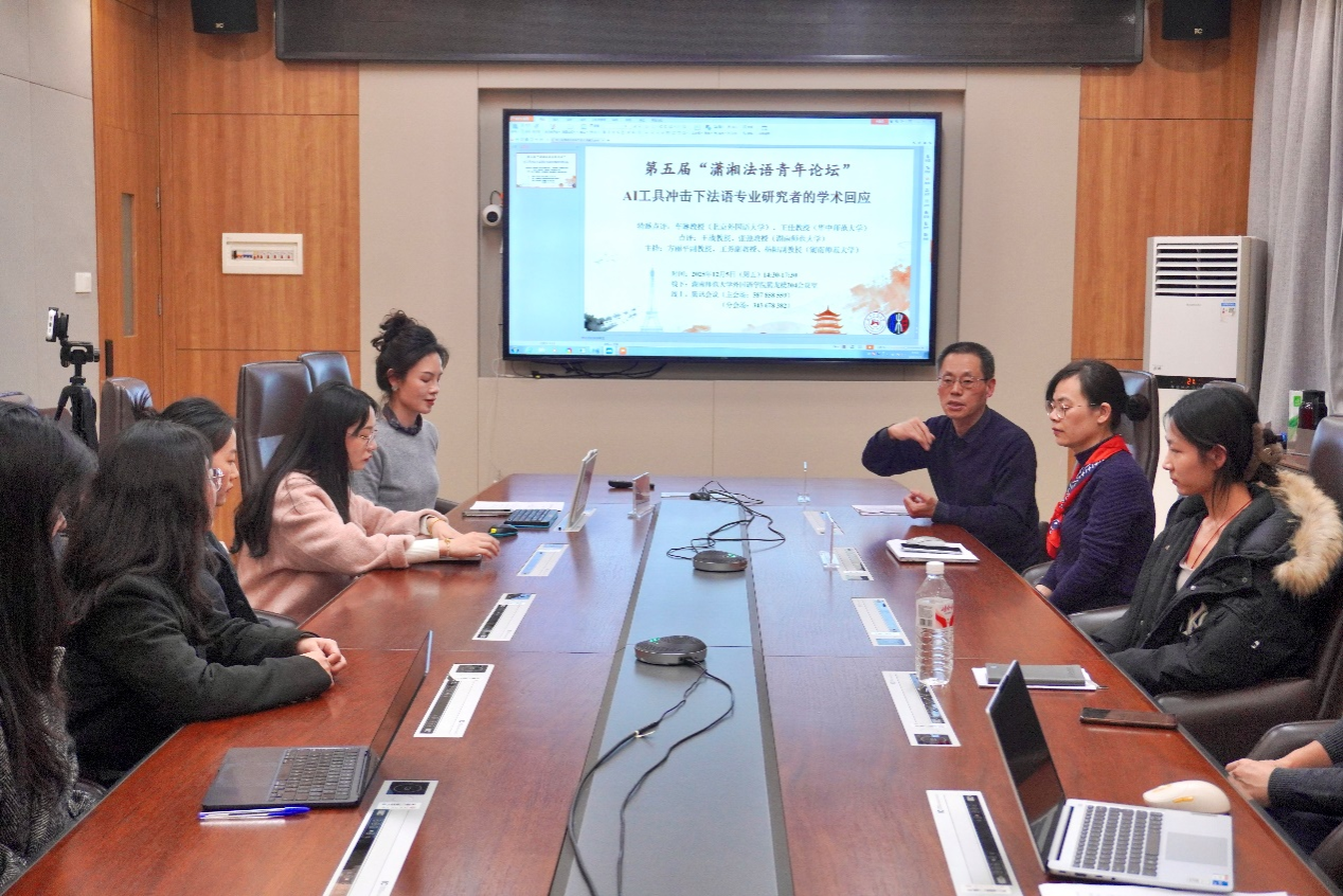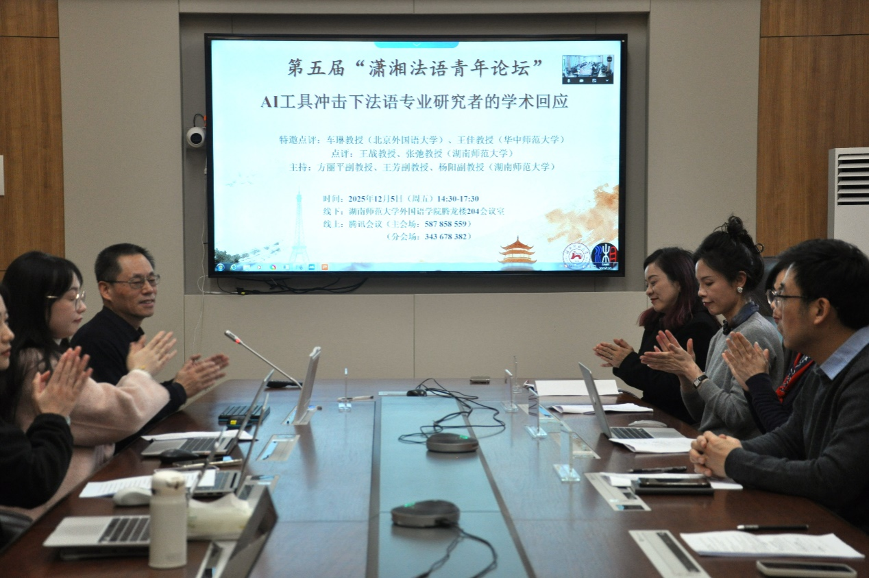 北京外国语大学车琳教授、华中师范大学王佳教授作为特邀嘉宾,与湖南师范大学王战教授、张弛教授共同点评本次论坛的参会论文和学生发言。论坛由法语系方丽平主任主持。会议伊始,她向线上线下参加本届论坛的各位师生表示热烈欢迎。