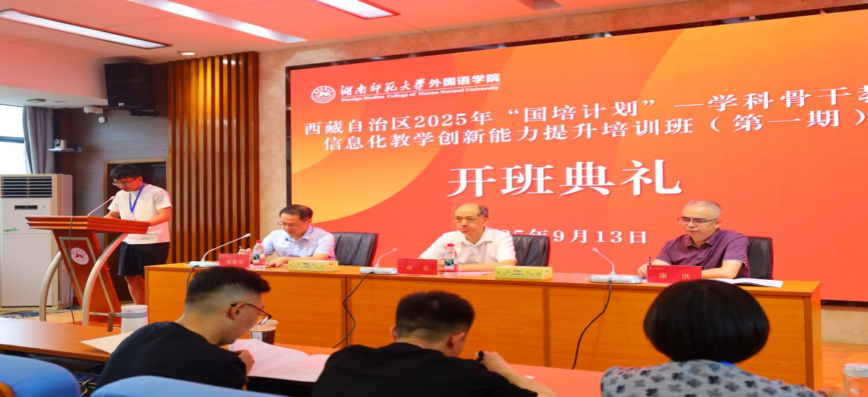 9月13日上午,西藏自治区2025年“国培计划”—学科骨干教师信息化教学创新能力提升(第一期)培训班开班典礼在湖南师范大学腾龙楼515报告厅顺利举行。湖南师范大学校党委委员、副校长杨震,校教育管理干部培训办公室主任康洪,外国语学院党委书记沈贤岚、副院长司徒皓、考培办主任宋静以及来自西藏自治区的118名学员参加此次开班仪式。开班典礼由沈贤岚主持。