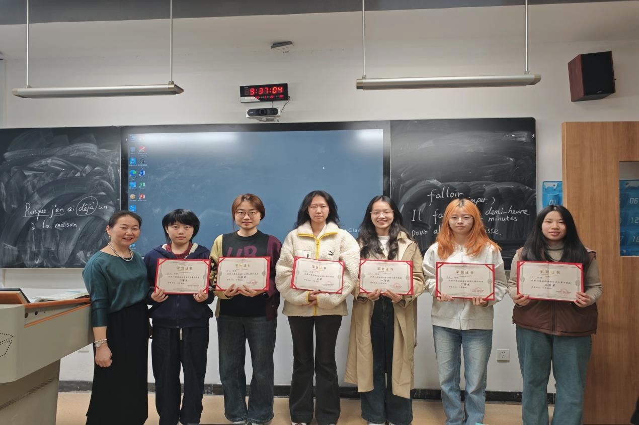 最后,评委老师们公布获奖名单:肖惠之荣获一等奖,吴晨希、林舒钰荣获二等奖,任思怡、曹萌、石萱荣获三等奖。获奖同学依次上台领取奖状与奖品,全体师生合影留念。至此,第六届法语语音语调大赛圆满结束。