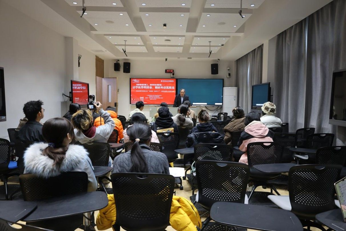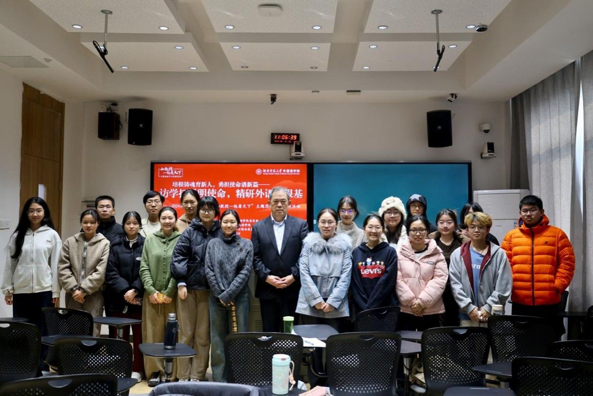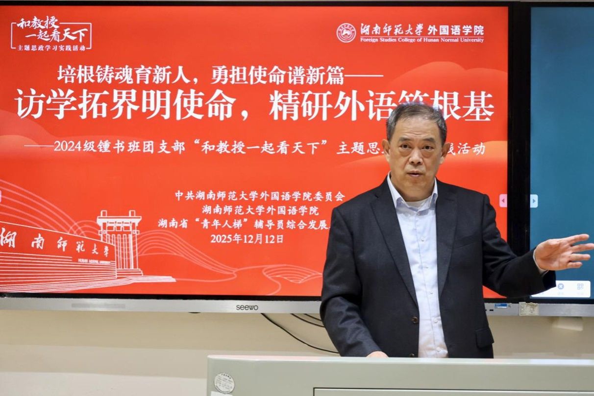 (通讯员 王蕾西 苏星璨)为深入学习贯彻党的二十届四中全会精神,全面落实立德树人根本任务,12月12日上午,我院2024级锺书班团支部于腾龙楼304教室开展 “和教授一起看天下”主题思政学习实践活动。此次活动以“培根铸魂育新人,勇担使命谱新篇——访学拓界明使命,精研外语筑根基”为主题,特邀中央电视台特约评论员,中国国际问题研究院美国研究所所长兼军控与国际安全研究中心主任,我校外交研究中心主任滕建群担任主讲人。