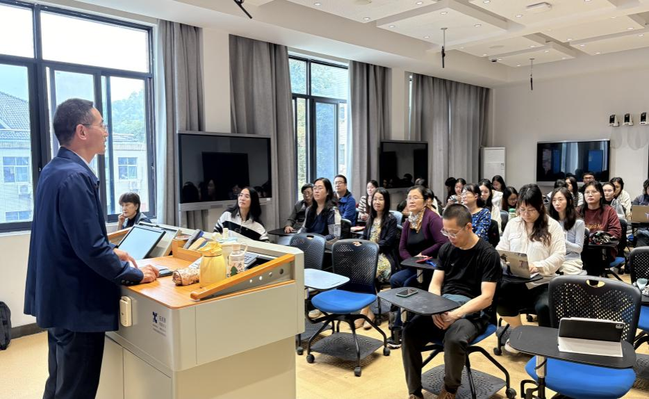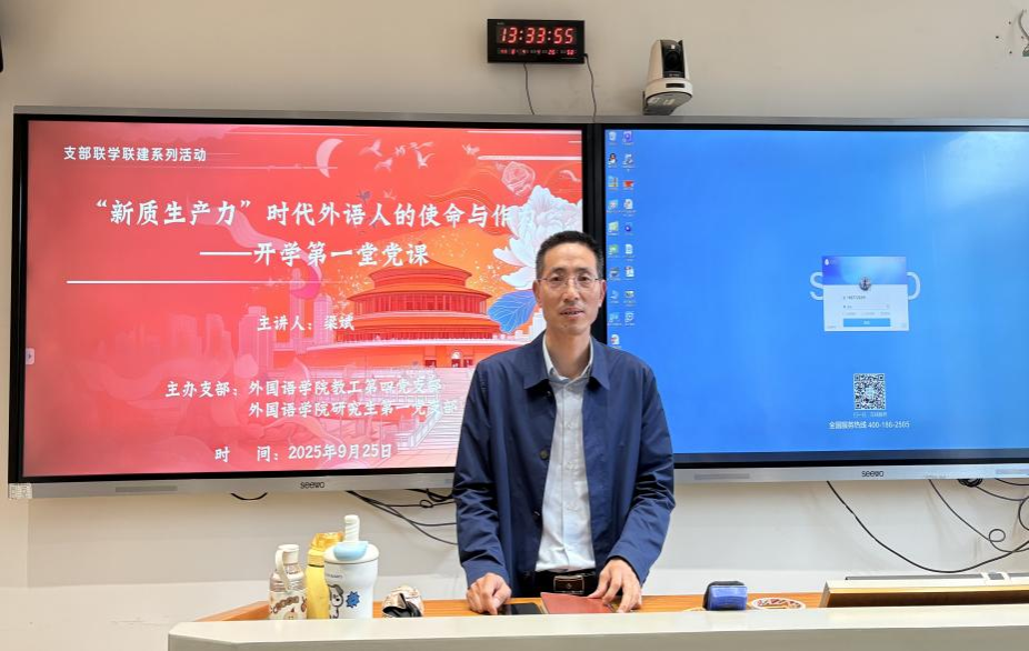 (通讯员 李湘)2025年9月25日下午,湖南师范大学外国语学院教工第四党支部与研究生第一党支部在腾龙楼404教室联合举办“开学第一堂党课”学习活动。本次活动以“新质生产力时代外语人的使命与作为”为主题,深入开展理论学习与交流研讨。活动由外国语学院副院长梁斌主持并主讲,两支部全体党员参加。