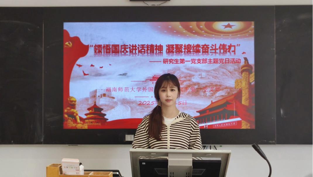 (通讯员 李湘)2025年10月15日,湖南师范大学外国语学院研究生第一党支部在腾龙楼604教室成功举办“领悟国庆讲话精神、凝聚接续奋斗伟力”主题党日活动。本次活动由支部副书记蔡佳珺主持,支部全体党员及入党积极分子参加。