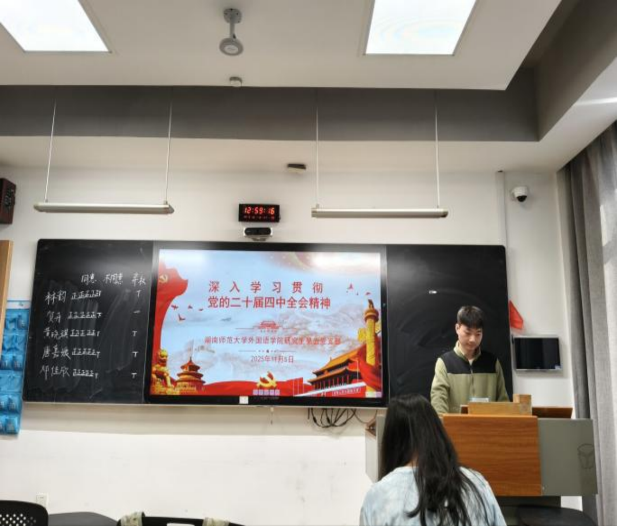 (通讯员 廖锦叶)为深入学习贯彻党的二十届四中全会精神,2025年11月5日,湖南师范大学外国语学院第五党支部于腾龙楼406教室成功举办主题党日活动。本次活动由张维东同志主持,支部全体党员参加。