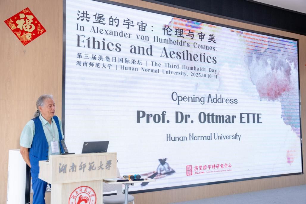 我校洪堡跨学科中心主任、“潇湘学者”特聘教授、柏林-勃兰登堡科学院院士Ottmar Ette教授首先感谢了外国语学院和中心同事的辛勤付出。他指出,洪堡学界目前致力于建立由若干洪堡研究中心组成的洪堡研究全球网络,这些中心分布于德国柏林、古巴哈瓦那、中国长沙,以及哈萨克斯坦的新建中心。与此同时,越来越多的中国学者参与洪堡研究。他还表示,2026年第四届洪堡日活动将在重庆举办,届时欢迎大家与会。