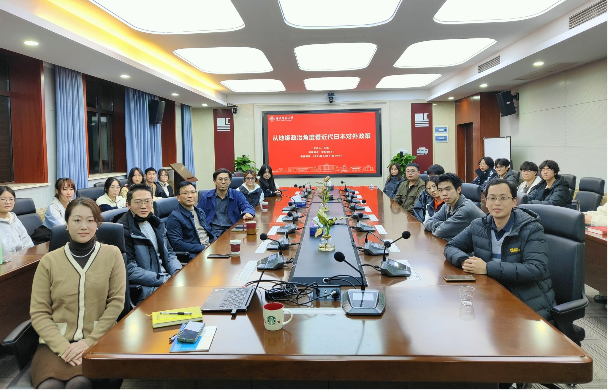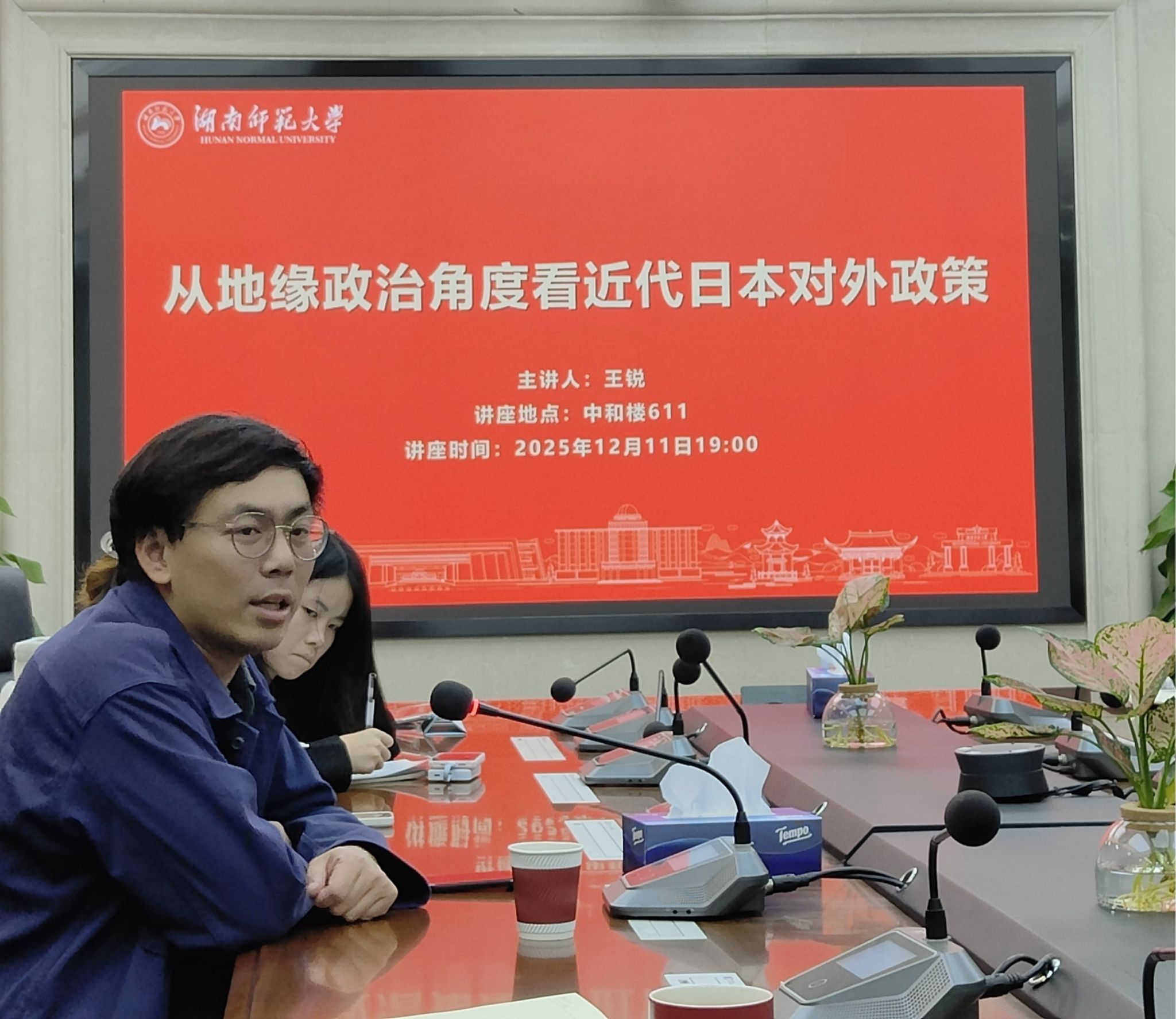 为拓展日语系师生的跨学科视野、促进外国语学院区域国别学的发展,12月11日,华东师范大学历史学系教授、博士生导师王锐应邀在中和楼611会议室开展了专题学术讲座。讲座以“从地缘政治角度看近代日本对外政策”为主题,为湖南师范大学日语系师生带来一场深度学术分享。王锐教授主要研究领域为中国近现代思想史、学术史、政治史。出版《文明等级论的表与里》等著作,论文见于《历史研究》《哲学研究》《政治学研究》《史学理论研究》等不同学科领域的顶级权威刊物。入选国家“万人计划”青年拔尖人才、中国历史研究院第四批“兰台青年学者”、上海市“曙光项目”人才计划。此次讲座由吴雅莉博士主持,日语系主任陈小法教授、我校历史文化学院李明楠副教授、邱亚副教授出席。参与人员除日语系师生外,还吸引了湖南第一师范学院部分学生。