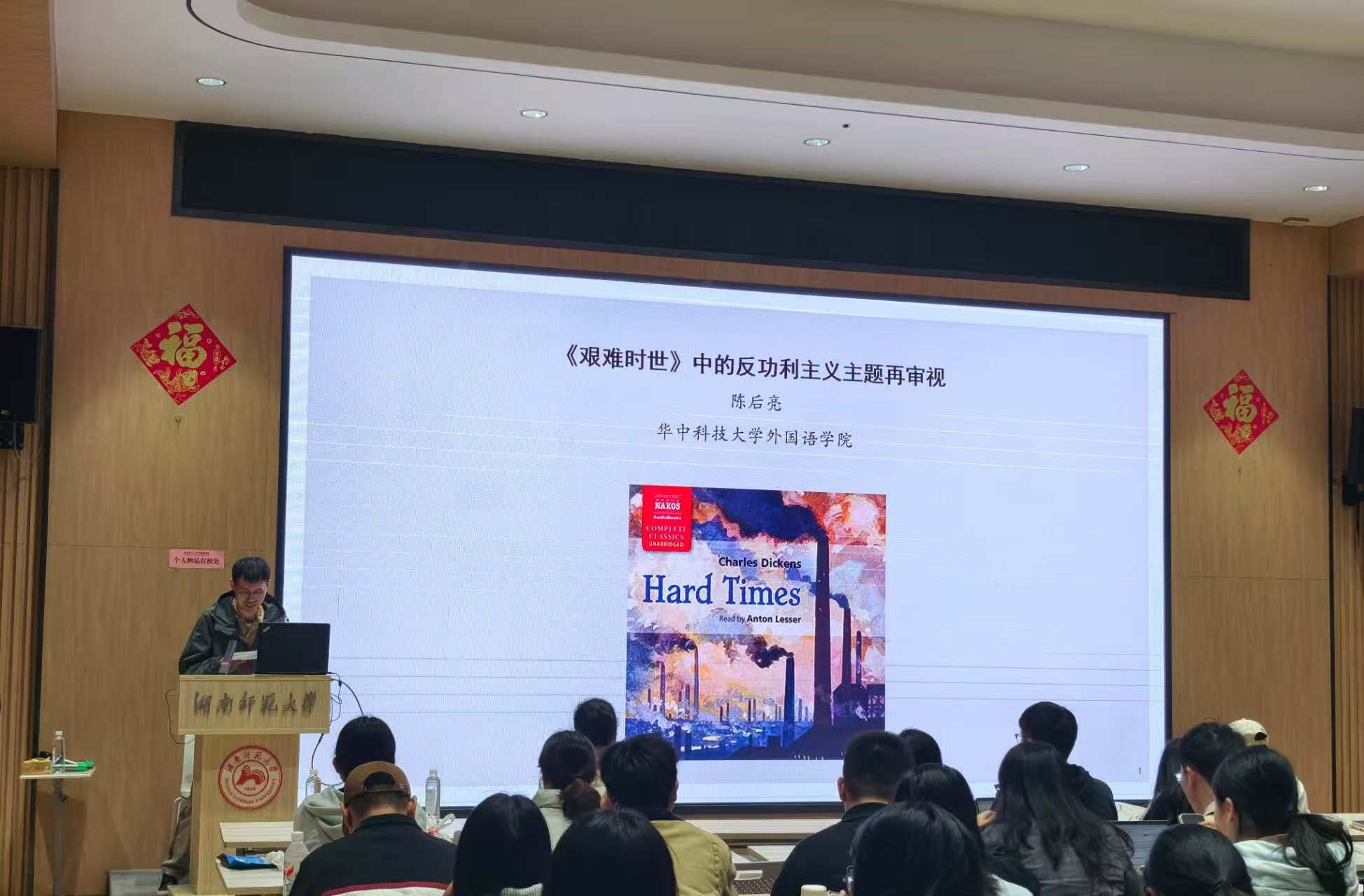 主讲环节,陈后亮教授以清晰的学术脉络,围绕功利主义核心观点,重点阐释狄更斯《艰难时世》的反功利主义主题,引领师生解读经典文学的思想内核。他首先聚焦功利主义理论发展,深入剖析J. Bentham(边沁)与J. S. Mill(穆勒)两位核心理论家的学术贡献,帮助师生系统掌握这一哲学思想。